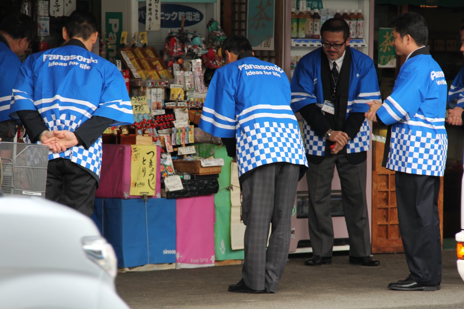 This was very interesting and we are not really sure what it really meant. A Panasonic mini van and car pulled up in front of this business and the men in the coats got out proceeded with a little ceremony in front of the shop proprietor. A lot of words, clapping and fan waving. Maybe prayers for the projected new year sales.